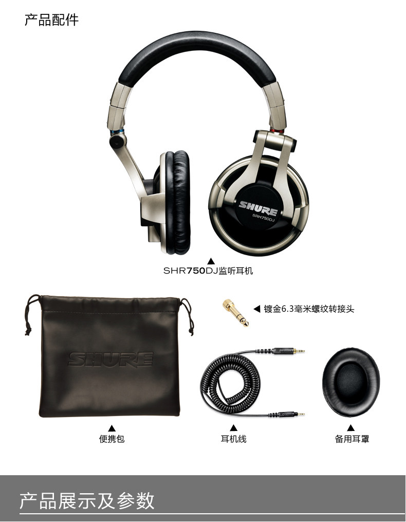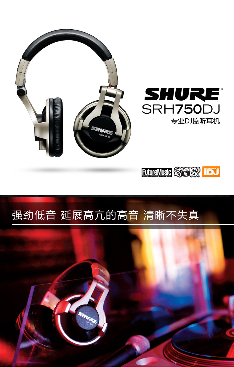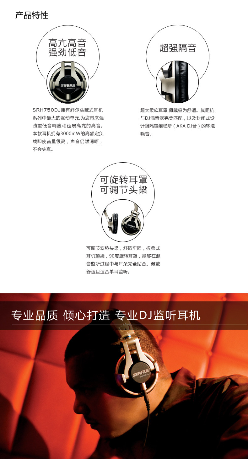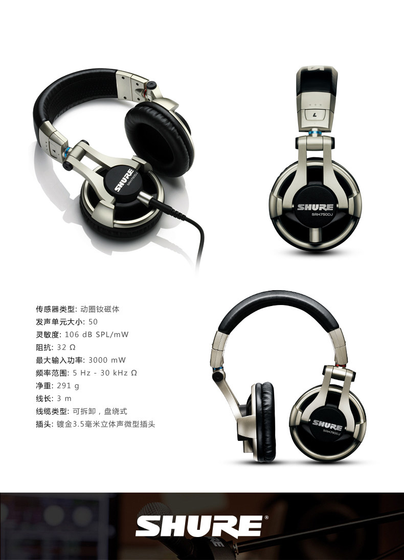 SRH750DJ头戴式耳机配有50毫米的钕磁体动圈驱动单元,可表现高输出低音和高亢的高音。耳罩可旋转90度,因此SRH750DJ能够满足现场专业DJ混音的要求。